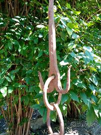 Antica catena da camino ad anelli forgiata a mano ( seconda metà 800 ) regolabile in lunghezza max m. 1,70 per supporto paiolo + due componenti per staff aggio anche forgiati a mano. Tutto come riportato in immagini.