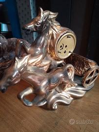 Raffinato articolo in ceramica lucidissima a imitazione del bronzo, riproduce una biga trainata da due cavalli scalpitanti con inserito orologio marca Mercedes, risalente il tutto alla metà del XX secolo.