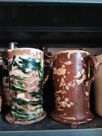 Antica terracotta pugliese originale pugliese Grottaglie Tre pezzi : un barattolo con coperchio e due brocche