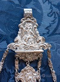 Antica e rara “chatelaine” inglese in argento sterling prodotta da Thornhill & Co. - 144 New Bond Street, London, 1934-1935. Si tratta di una “chatelaine” in argento finemente lavorata in rilievo (a sbalzo) e con incisioni, dotata di cinque rami con clip a ciascuna estremità. Thornhill & Co. ha prodotto nel XIX secolo diverse “chatelaines” per i sovrani dell’Inghilterra (in particolare una grande “chatelaine” in acciaio per la regina Vittoria nel 1850) e per nobili donne e uomini della Gran Bretagna. Sul retro, in corrispondenza del gancio, la “chatelaine” è marchiata Hallmarks come Londra 1934-1935; ha una lunghezza di circa 21 cm ed un peso di circa 130 grammi (escluse le medaglie). Pure le medaglie sono in argento sterling e sono marchiate Hallmarks come Birmingham rispettivamente 1901 – 1903 (quelle con sigillo in oro rosa) e 1922 – 1948 le due rimanenti; il peso totale, comprese le medaglie, è di circa 170 grammi. Prezioso e raro oggetto da collezione.