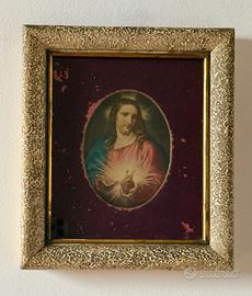 Antica cornice con piccola riproduzione pittorica datata 1953 del Sacro Cuore di Gesù il cui Originale, realizzato da Pompeo Batoni nel 1767, è conservato nella relativa cappella presso la Chiesa del Gesù a Roma. La piccola pittura è incorniciata con passepartout in vellutino bordeaux (con evidenti segni che ne caratterizzano l'antica piacevolezza e vetro del medesimo periodo a protezione. Il soggetto del sacro Cuore di Gesù simboleggia l’amore e la misericordia di Cristo verso l’umanità. (4/11/1953 Casa dell’annunciazione/Roma). Dim. cornice cm 22x25h Dim interna cm. 15,5x18,5h. Ovale con riproduzione pittorica dim. cm.9x12h.