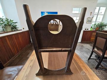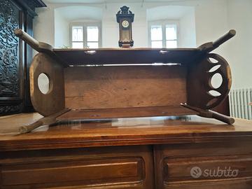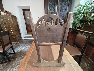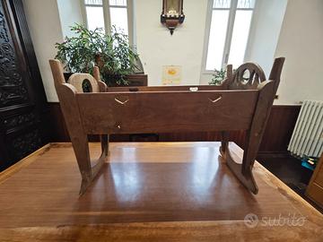 Antica culla Alta Valsesia. Culla a dondolo antica in legno massiccio di noce locale. Presenta intagli decorativi alle estremità e fori laterali per facilitarne lo spostamento. Un pezzo d'arredamento tradizionale realizzato in modo artigianale senza colle o chiodi, solo spine di legno. Bellissima e rara culla in legno massello di noce metà '800, struttura sana, buone condizioni, leggeri segni del tempo, guardare attentamente le foto allegate in inserzione Mai restaurata!!! Misure: Lunghezza 82 cm., larghezza 37 cm., altezza 57 cm. Peso Kg. 10 circa.