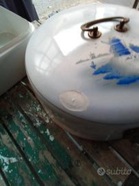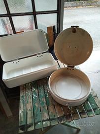 Antica custodia per il pane in metallo smaltato. Quello rettangolare di origine tedesca Quello rotondo olandese. Vendo anche separatamente 40€+40€. più sp. sped.