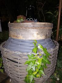 Vendesi pezzo unico d'arredamento realizzato a mano tramite upcycling artistico. Il cuore dell'opera è una splendida damigiana d'epoca in vetro pesante scuro, capovolta e incastonata in una struttura che richiama le antiche tradizioni vinicole. La parte superiore è rifinita con una fascia di botte originale in legno massello, mentre la base è costituita da un cesto intrecciato dal design moderno. Dettagli: Elemento principale: Damigiana antica in vetro (capacità stimata 5 litri). Materiali: Legno di botte, vetro d'epoca, intreccio sintetico grigio, rete metallica di rinforzo. Stile: Industrial / Rustico Siciliano / Shabby Chic. Allestimento: Interno decorato con elementi naturali e terra, visibili attraverso il vetro. Stato: Eccellente pezzo da esposizione, solido e imponente. Note di Vendita: Un oggetto che racconta una storia, ideale per chi cerca un pezzo unico per la propria casa o attività. Ritiro a mano a Messina o spedizione tracciata.