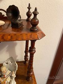 Antica etagere inglese di forma rettangolare (cm.54x35), con profili minuziosamente intarsiati in varie essenze. Realizzato nel periodo Vittoriano, è composto da 4 ripiani tenuti tra loro da colonnine tornite. Al centro dei ripiani sono presenti eleganti intarsi in legno di frutto. Poggia su piedini a cipolla calzati da rotelle girevoli. L'altezza complessiva è di ca. 160 cm. Ottimo stato di conservazione.
