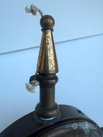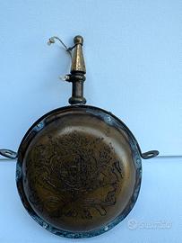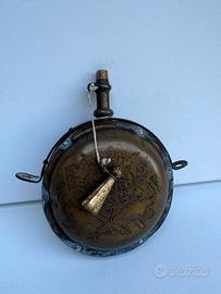 Antica fiaschetta per polvere da sparo risalente al XVIII. E' realizzato in metallo, con corpo ovale appiattito e un collo troncoconico. La superficie è decorata con uno stemma araldico inciso, di origine austriaca.