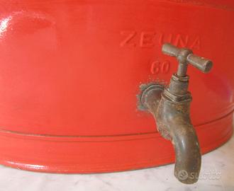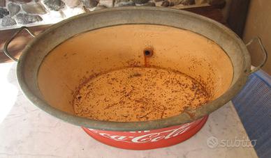 Antica ghiacciaia da banco della Coca Cola risalente agli anni ’30-’40, ha una capienza di 60 litri in cui ci veniva messo il ghiaccio assieme alle bottiglie così da tenerle in fresco poi quando il ghiaccio cominciava a sciogliersi veniva parzialmente svuotata grazie al rubinetto dando la possibilità all’esercente di aggiungere nuovo ghiaccio. L’oggetto è stato prodotto dalla ditta ZEUNA, le misure sono: ai manici cm 67 x cm 48x5 di larghezza x altezza cm 26. La vasca non è a tenuta stagna perché presenta qualche piccolo forellino qua e là ed uno dei due manici ha subìto un distacco da una parte come evidenziato in foto.