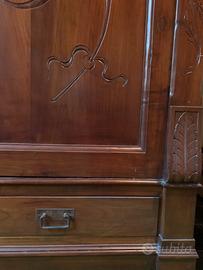In ottime condizioni, segni di tarme sui piedi. All’interno è stata rimossa l’asta appendiabiti e sono stati inseriti dei ripiani per adattarla a libreria. Un cassetto vero in basso a destra, uno cieco in basso a sinistra.