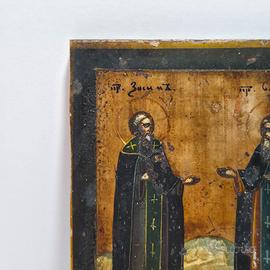 Antica icona ortodossa risalente alla fine del XIX secolo raffigurante due santi in posizione eretta su sfondo dorato.