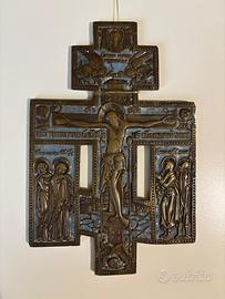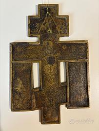 Antica Croce in bronzo del XIX secolo. Detta Croce a otto punte. il Cristo Crocifisso e’ rappresentato secondo stile bizantino. La Croce devozionale molto venerata nel mondo ortodosso russo. Dimensioni: Larghezza 11 cm Altezza 17 cm