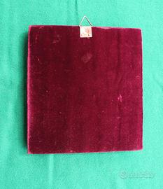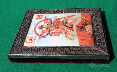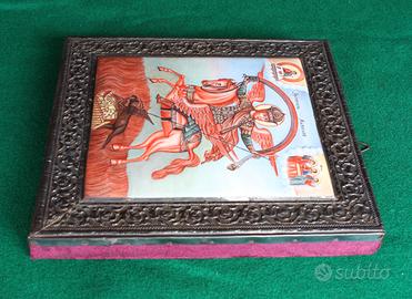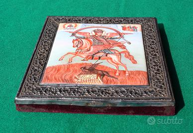 Antica, rara e stupenda icona russa prodotta nel 1760 circa, in ottimo stato di conservazione, che su lastra di rame smaltata raffigura l’arcangelo San Michele su un cavallo alato, che cattura il demonio; in alto a destra tre santi; in alto a sinistra Cristo. La cornice è in argento finemente trattato con laccatura protettiva antiossidante e con pregiata decorazione a sbalzo; su ciascun bordo della cornice in argento è presente il punzone “BA”, che indica la città di Mosca; inoltre, un bordo è punzonato con “84” e con un simbolo che sembra rappresentare un’aquila (identifica l’autore dell’opera). Il marchio “84” significa 84 zolotniki ossia 84/96 parti di argento puro, equivalenti al titolo di 875/1000; l’opera è attribuita al russo Alexei Vasiliev Polozov, attivo dal 1758 al 1768. Sul retro, il supporto è rivestito in velluto viola. Dimensioni rispettivamente senza e con cornice: 14 x 16 cm, 20 x 22 cm; spessore 2,7 cm circa.