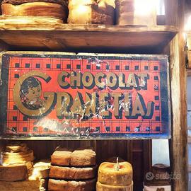 L’aria è satura di un profumo denso e avvolgente: cioccolato fuso, zucchero caramellato e una lieve nota di vaniglia si mescolano nell’atmosfera. Le assi del pavimento scricchiolano leggermente sotto i passi incerti di un bambino che, con il naso incollato al vetro del bancone, fissa con occhi spalancati montagne di caramelle avvolte in carte lucide, file di tavolette di cioccolato disposte con ordine, scatole di latta ornate da illustrazioni raffinate. Su uno scaffale in legno scuro, tra le confezioni dai colori sgargianti, un’insegna in metallo richiama l’attenzione: “Chocolat Granetias”. Il rosso acceso del fondo, incorniciato da un motivo geometrico elegante, si staglia tra le tonalità pastello delle confezioni di zucchero filato. Realizzata tra gli anni ’20 e ’40, questa insegna è un perfetto esempio di stile Art Déco, con il suo design audace e geometrico, caratteristico del periodo. Le lettere, imponenti e dorate, sembrano scolpite nella lamiera smaltata, con un’eleganza che richiama il lusso e la modernità dell’epoca. La grande “G” iniziale incornicia il volto sorridente di un bambino, un dettaglio illustrativo tipico delle pubblicità dei primi decenni del Novecento, concepite per trasmettere familiarità e dolcezza. Lo sfondo, decorato con una griglia nera su base rossa, esprime perfettamente l’estetica dell’Art Déco, giocando su forme regolari e contrasti netti. L’insegna porta la firma di Giacomo De Andreïs, produttore marsigliese di insegne e scatole in latta, attivo dal 1922. Un pezzo di passato che oggi continua a incantare, riportando chiunque lo osservi al dolce sapore della nostalgia. Dimensioni: 39,5 x 19 cm.
