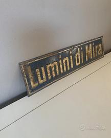 Ultra rara insegna pubblicitaria Lumini di Mira (antecedente Mira Lanza). Antica della fine dell’800. In metallo a rilievo. Molto usata e vissuta come da foto. Misura 40x10cm.circa.