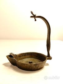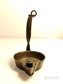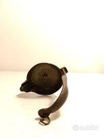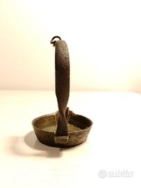 Antica lampada a olio in bronzo o ottone, risalente probabilmente al XVIII o XIX secolo. Questo tipo di lampada, con la sua forma semplice a "padellina" e un manico ad arco con uncino per appenderla, è un esempio di illuminazione domestica storica.