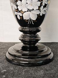 Lume d’epoca di fine XIX secolo, realizzato in vetro opalino nero con raffinato decoro floreale e uccellino dipinto a mano con dettagli dorati. Nato originariamente come lampada a petrolio, è stato successivamente elettrificato mantenendo intatto il fascino autentico e le parti in ottone originali.