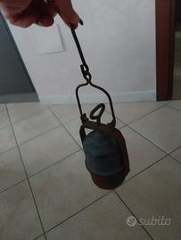 Lampada da minatore di origine francese, un pezzo d'antiquariato con un design robusto. Struttura in metallo con finitura invecchiata. Gancio per sospensione. Non funzionante.