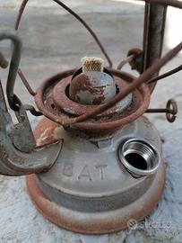 Antica lanterna portatile a Petrolio/Cherosene BAT 158 prodotta negli anni '50 in Germania funzionante. Struttura in metallo su piede a sezione circolare con ampolla in vetro, sfiati, manico e gancio per appenderle. La lampada ha un serbatoio con chiusura a tappo, il tappo ha sopra lo stemma del pipistrello, stemma che è riportato anche sulla base della lanterna insieme alla scritta BAT e N.158. Nel serbatoio una volta si versava petrolio o cherosene, adesso si può usare l’olio o altri combustibili, lo stoppino, regolabile tramite una rotellina, serve per accendere la fiamma. Per farlo basta alzare la leva, posta nel fianco, che alza l’ampolla e con un comune fiammifero si potrà accendere lo stoppino. Con la rotellina si regola l’altezza dello stoppino e di conseguenza la potenza della fiamma. Il coperchio ha una molla che tirando verso l’alto permette di estrarre l’ampolla di vetro e pulirla e di ricaricare lo stoppino. Queste lampade erano chiamate anche Uragano perché erano resistenti agli agenti atmosferici e quindi funzionanti anche in condizioni climatiche avverse. L'oggetto è originale e mostra segni di usura coerenti con l’età, con una bellissima patina d’epoca, rendendolo un ottimo pezzo da collezione o restauro. Ideale per appassionati di antiquariato, collezionisti o per arredamento vintage. Misure H 24 cm, L 16 cm, P 12 cm. Possibile ritiro a mano a Bologna.