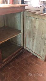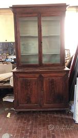 Antica libreria toscaba con due ante con vetri soffiati e credenza alla base, interno tinteggiato nella tonalita del celeste. Mobile sorretto da 4 cipolle alla base. Laccata a finto legno