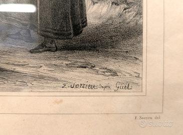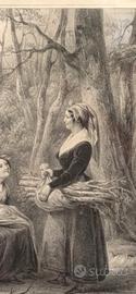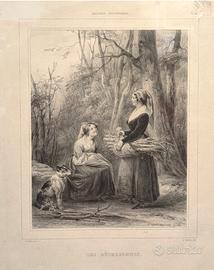 incisione litografica firmata in basso Felix Sorrieu (XIX), incisore francese. L'opera ritrae una scena pastorale con due figure femminili in un momento di riposo dal lavoro. Il titolo "Les bucheronnes" indica due taglialegna. In ottime condizioni conservative come da fotografie, entro cornice con vetro. DIMENSIONI CORNICE: 40,5 x 32 cm