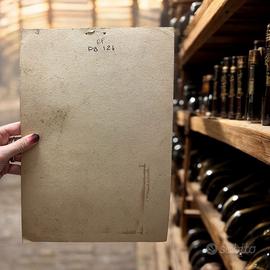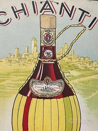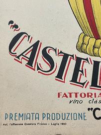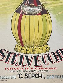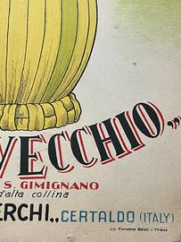 Era l’estate del 1950. Le colline attorno a San Gimignano ondeggiavano come un mare verde sotto il sole, e l’aria portava con sé il profumo dolce dell’erba tagliata e dei tini ancora umidi. In una piccola osteria affacciata su un viottolo di campagna, un uomo affiggeva con cura questa locandina: “Chianti Castelvecchio – Fattoria in S. Gimignano”. Stampata su cartoncino, autorizzata dalla Questura di Firenze nel luglio di quell’anno, questa pubblicità non era solo un invito a bere un vino — era una promessa di ritorno alla vita, alla convivialità, a quel sapore sincero che il tempo di guerra aveva fatto dimenticare. Il fiasco, avvolto nella sua paglia dorata, campeggia al centro dell’immagine come un piccolo monumento contadino. Dietro di lui, in un acquerello sfumato, si riconosce l’inconfondibile profilo di San Gimignano, con le sue torri che sembrano dita protese verso il cielo. Le lettere in rosso e nero, decise e danzanti, sembrano voler chiamare a raccolta i passanti: “Venite, assaggiate il vino classico d’alta collina, nato dalla terra e dal tempo”. Oggi questa locandina non è più appesa alla parete di un’osteria, ma conserva intatto il suo incanto. È una finestra aperta su un’Italia che risorgeva con lentezza e poesia, brindando con un sorso di Chianti alla speranza, alla bellezza semplice delle cose fatte con amore. 33 x 23 cm.