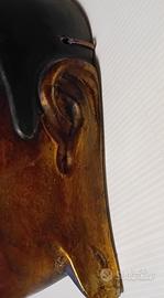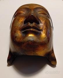 Antica maschera giapponese in legno dorato, copia del volto della statua tesoro nazionale " Shii Bosatsu" (Budda Bosatsu del tempio Chuguji situato in Ikaruga cittadina distretto di Ikoma prefettura di Nara). La scritta all'interno tradotta significa "copia del tesoro nazionale Shii Bosatsu"
