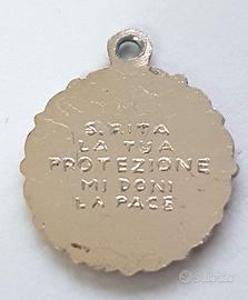 Piccola Medaglia antica raffigurante Santa Rita da Cascia in preghiera con dettagli dorati su sfondo arancione. Cornice decorata in metallo argentato e incisione “Santa Rita La Tua protezione mi doni la pace”