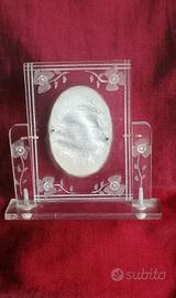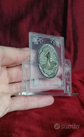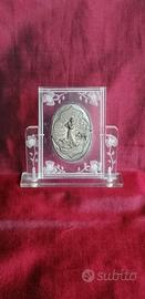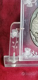 Antica medaglia sacra incorniciata su supporto in plexiglass finemente intagliato. La medaglia riporta la scritta B. PANACEA V. M. e rappresenta un pastorella in preghiera. La medaglia porta i segni del tempo ma è leggibile ed è in patina. La cornice in plexiglass è integra. Dimensioni totali 7 x 7 x 1 cm circa.