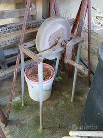 Antica mola a manovella con sostegno in metallo. Da ripulire e oliare.