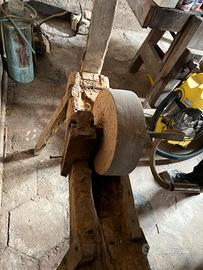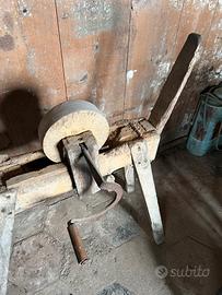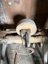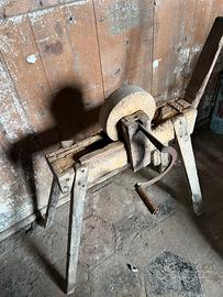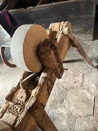 antica mola a pedale, strumento utilizzato per affilare lame di coltelli, falci e altri utensili da taglio. Diponibili altri oggetti antichi
