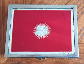 Vendo antico/vintage necessarie/parure anni 1920/30 per manicure così composta: n. 1 piccolo coltello n. 1 solleva cuticole n. 1 piccola forbice n. 1 piccola lima di acciaio n. 1 piccolo contenitore oblungo tondeggiante (porta rossetto?) n. 1 piccolo attrezzo lucida unghia con pelle di daino. Tutti i piccoli attrezzi, che sono in acciaio inox compresi i manici, sono fermati con anelli di pelle rossa al sottostante ripiano in velluto rosso scuro. La scatola, delle dimensioni di cm. 16*12*3, ha una struttura in acciaio inox così come i piedini. E’ presente, sul lato interno della parte apribile incernierata, uno specchio con bordi perimetrali smussati. La parte superiore esterna della scatola è costituita da un vetro con parte centrale colorata dello stessa tonalità del velluto, con al centro una stella stilizzata incisa . Scatola e attrezzi privi di nome e dati. Condizioni: poco usato e quindi in buone condizioni generali in considerazione degli anni, ma con il vetro esterno scheggiato in alto dx e tracce di ossidazione. Scatola senza ammaccature con clip di chiusura ancora perfetta. Specchio interno con tracce di ossidazione. Attrezzi con leggere tracce di ossidazione. Mancano 2 attrezzi. Unico proprietario. Venduto come pezzo da esposizione. Il tutto come da fotografie.