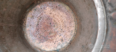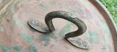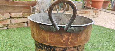 Pentola antica in rame battuto a mano completa di coperchio. Questa pentola inizia la sua storia in una cucina in muratura alimentata a legna, nell'entroterra siciliana dei primi anni del 1900. Il suo colore di rame consumato e l'odore di fumo raccontano la povertà e la miseria di quell'epoca caratterizzata dai grandi sacrifici dei contadini che stanchi si raccoglievano attorno al focolare respirando gli odori ed i profumi che dalla pentola venivano fuori. Una pentola oggi vuota e fredda ma piena di storia e calore umano.