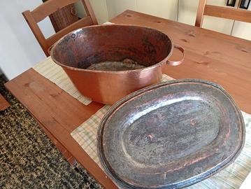 Vecchia pentola ovale in rame, ideale per collezionisti o come pezzo d'arredo. - Manici laterali. - Coperchio con manico centrale. Larghezza 36 cm Profondità 25 cm