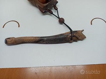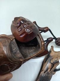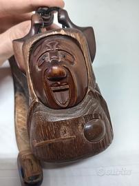 Antica Pipa Kiseru Giapponese Periodo Meiji. Con contenitore per il tabacco e porta pipa in legno Il contenitore raffigura il risveglio di Daruma tipico soggetto per questo tipo di oggetti La faccia si solleva per l'apertura Il porta pipa è scolpito a simulare un drago e la pupa si innesta all'interno L'insieme rimane saldo quando è in sospensione poiché tutto è tenuto insieme dal cordino che è stato sostituito poiché quelli originale era rotto e sfibrato Le condizioni generali sono comunque ottimali nin presenta danni o mancanze