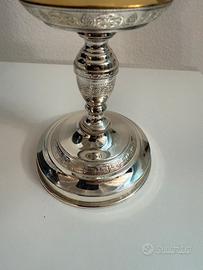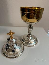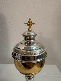Antica pisside in metallo argentato con coppa in argento dorato. (XIX secolo)