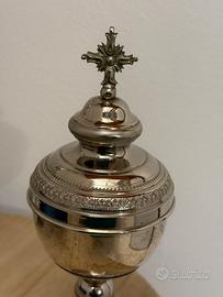 Antica pisside in metallo argentato con coppa in argento. (XIX secolo)