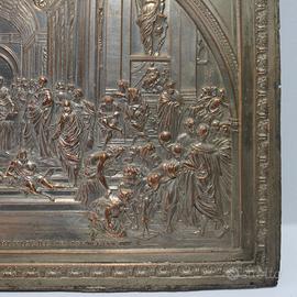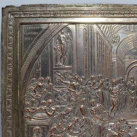 La placca Misura 162 x 102 mm ed è molto ben eseguita nei particolari e nei dettagli, riproduce fedelmente la scuola di atene di raffaello sanzio. E' in ottime condizioni con argentatura mancante nei rilievi e perdite di metallo nei bordi.