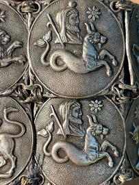 Le placche, cucite a mano su una base di stoffa blu, raffigurano sovrani del regno Sassanide, insieme a creature mitologiche e segni zodiacali.