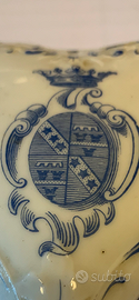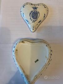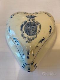 ANTICA E RARA PORCELLANA A FORMA DI CUORE, BIANCA E BLU, CON STEMMA NOBILIARE E CORONA, con marchio "GINORI" in colore verde -