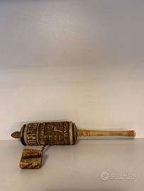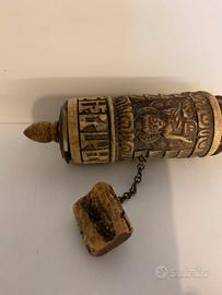 ANTICA RUOTA BUDDISTA TIBETANA. Formata da un cilindro innestato su un manico e chiuso poi in alto da un coperchio a punta. Il cilindro, che ruota sul perno centrale, è interamente decorato e inciso con simboli buddisti.