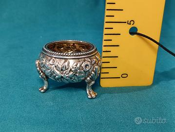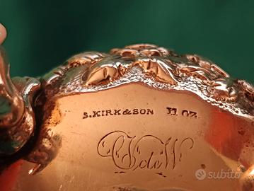 Antica saliera su piedini-S. Kirk & Son Piccola saliera da tavola con decorazione floreale a rilievo. Marchio S. Kirk & Son-11 ozinciso sul fondo Produzione americana, metà XIX secolo (circa 1846-1860). Dimensioni: diametro circa 4,5-5cm, altezza circa 3 cm. Prezzo richiesto: 165 € L'oggetto non è stato pulito né lucidato, conservato nello stato originale; eventuale pulizia a discrezione dell'acquirente. ...originale d'epoca, ideale per collezionisti. Disponibile spedizione accurata o ritiro a mano.