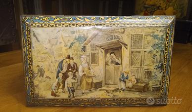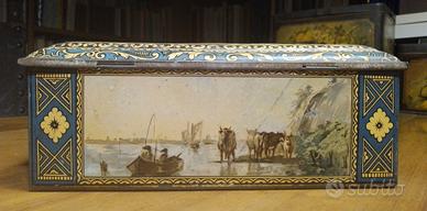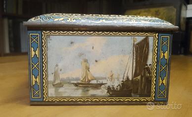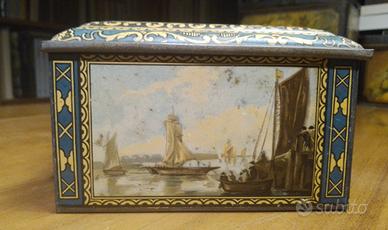 Antica scatola di latta francese del 1900. Scene marine e mercanti del pesce. Litografie ancora intatte nessun graffio vistoso o macchie di ruggine. Sul coperchio ci sono piccolissimi ritocchini con un pennarello dorato a punta fine che sarebbero facilmente eliminabili con Rugginet ma che io mi sono semplicemente limitata a sbiadire un po' perché non mi dispiacciono, danno luce alla scatola. C'è una leggera ammaccatura sul coperchio che si rimette in sesto premendo col pollice all'interno ma che poi torna in quello stato se si fanno