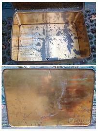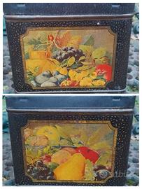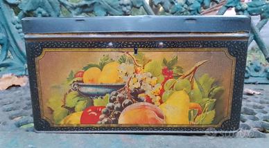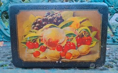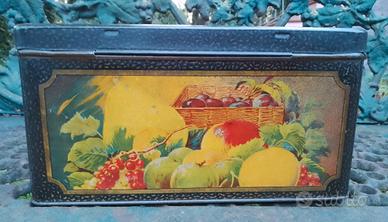 Capiente scatola di latta francese con specchio. Litografie in buone condizioni. Cornici nere, con piccole spennellate color oro che in alcuni punti appaiono scolorite, incorniciano frutti misti colorati. Dentro il color oro si è mantenuto, salvo alcune macchie sul fondo. Niente ammaccature se non minime. Niente ruggine. 26,5 x 18 x 14 cm.