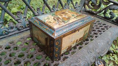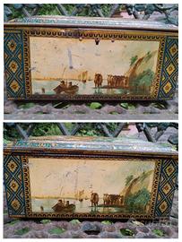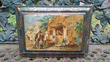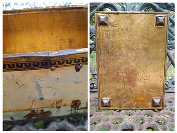 Antica scatola di latta francese del 1900 di grandi dimensioni 27x19x13 cm con litografie uguali ad un’altra scatola di taglia più piccola che ho in vendita su questo sito. Scene marine e mercanti del pesce. Litografie ancora intatte con pochi grafietti. Il color oro dei bordi e della parte interna è ancora in buono stato. Ha un piccolo taglio sul bordo superiore nella parte frontale (vedi foto). Ha uno specchio circondato da litografie dorate molto decorative