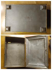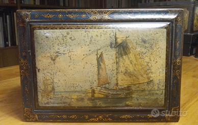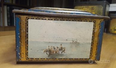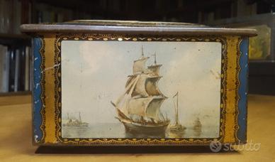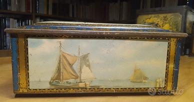 Antica scatola di latta francese dei primi del 900 con litografie ben conservate di barche e velieri. Difficile da reperire sul mercato. Probabilmente conteneva tè. Bella, elegante. Piccole ammaccature e macchioline sul coperchio. Di taglio medio grande 24x17x 10,5 cm. Su questo sito ne ho anche una di taglia più piccola molto simile.