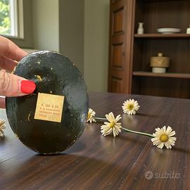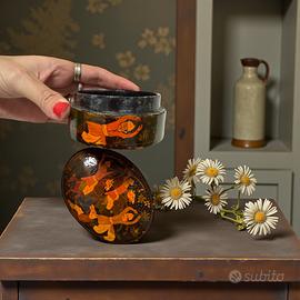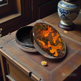 Scatola ovale con coperchio in papier-mâché laccato e dipinto a mano. Decorazione: scena figurativa kashmira (figure danzanti, cavalli, vegetazione). Provenienza: Srinagar, Kashmir – India. Etichetta originale: B. Dar & Co., P.O. Rainawari. Epoca: circa anni 1930–1940. Misure: 10,5 × 8 cm – altezza 4,2 cm. Condizioni: buone, con normali segni del tempo coerenti con l’età.