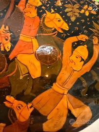 Aprire questa scatola è come sollevare il sipario su una danza che non si è mai fermata. Sotto la lacca scura, figure leggere continuano a muoversi: uomini con turbanti, cavalli stilizzati, braccia alzate in un gesto che sembra rituale, quasi musicale. È una scena viva, ritmata, sospesa nel tempo, dipinta a mano su papier-mâché secondo la tradizione del Kashmir. Questa piccola scatola ovale nasce a Srinagar, e lo racconta senza bisogno di parole: nei colori caldi, nei fondi punteggiati d’oro, nell’equilibrio tra movimento e silenzio. Era pensata per contenere oggetti personali, gioielli o monete, ma oggi custodisce soprattutto un immaginario lontano, arrivato fino a noi attraverso le rotte dell’artigianato d’esportazione. Sul fondo, una vecchia etichetta originale ci restituisce un nome e un luogo precisi: B. Dar & Co., Rainawari, Srinagar – India. Non una firma artistica, ma una traccia autentica di bottega, di mani che hanno lavorato per raccontare storie a chi stava dall’altra parte del mondo. Una famiglia di bottegai che fu attiva circa dal 1850 al 1950. Una scatola piccola, sì. Ma dentro, c’è un intero racconto che aspetta solo di essere riaperto.