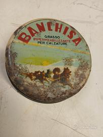 Antica Scatola Latta Pubblicità BANCHISA Grasso Calzature Pietro Rossi Anni '30. Presenta segni di usura e parti con ruggine