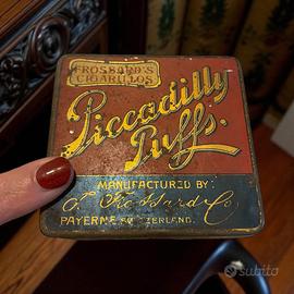 Aprì la scatola con un gesto lento, le dita rugose scivolarono sul coperchio litografato. Il nome “Piccadilly Puffs” brillava ancora, con quei suoi toni rossi e dorati, come se non volesse cedere al trascorrere degli anni. Era la pausa di un gentiluomo nella Svizzera di fine Ottocento, il nome Frossard non era solo un marchio: era sinonimo di qualità. Da Payerne, un piccolo centro nel Canton Vaud, partivano ogni giorno migliaia di cigarillos confezionati a mano, destinati ai caffè eleganti di tutta Europa. E questa scatola, solida e decorata, serviva per custodirli con orgoglio. Ma la vera meraviglia era all’interno. Sollevando il coperchio, si svelava una litografia industriale, oggi sorprendentemente rara: una veduta dello stabilimento originale, con la ciminiera fumante e le scritte in facciata che raccontano ancora una storia di manifattura, precisione, ambizione. È come guardare in controluce la storia del lavoro, della fatica, dell’ingegno svizzero.