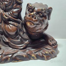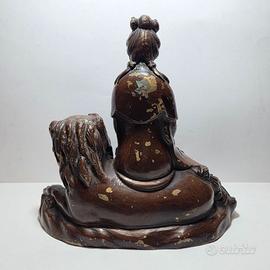 Antica Scultura Cinese Guanyin Seduta Su Cane Foo - Bronzo Laccato - Ca. 1900