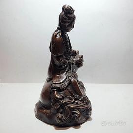 Fusione in bronzo a cera persa raffigurante la divinità Guanyin seduta su un Cane di Foo.